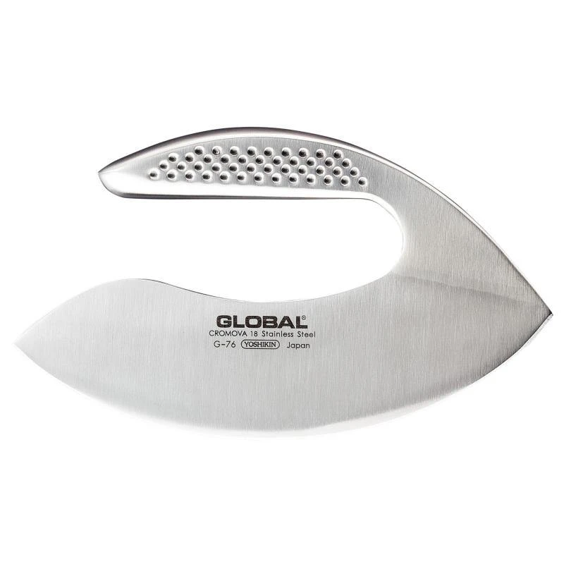 Part of the extensive GLOBAL knife range from Japan. This curved chopping blade is razor-sharp and makes easy work of herbs but can also be used to dice meat and finely chop onions. Known as a mincing knife in our range but also called Mezzaluna, this culinary tool is a must-have for any serious chef.