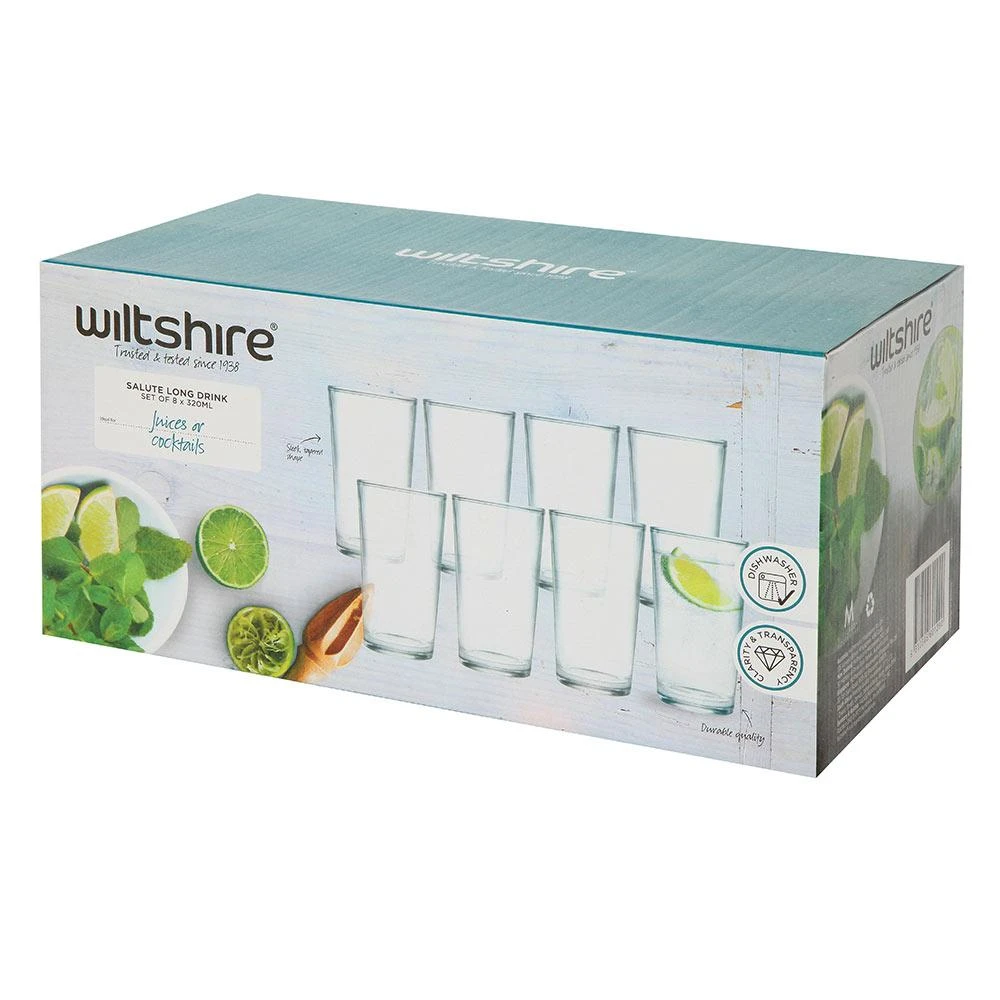 Sip on delicious sweet cocktails, iced tea and other refreshments with your friends using the stylish Wiltshire Salute Tumblers Set of 8! Boasting an elegant, these glasses are fantastic for bringing a touch of sophisticated style to both formal and casual dining occasions. Ideal for serving anything from delicious sweet cocktails to fresh juice. They are crafted from premium quality glass and feature brilliant clarity and transparency to show off the vibrant colours of your drink. Presented beautifully packaged in a Wiltshire box, the Salute Tumblers Set of 8 make a fantastic gift for house warmings, birthdays and other special occasions.
