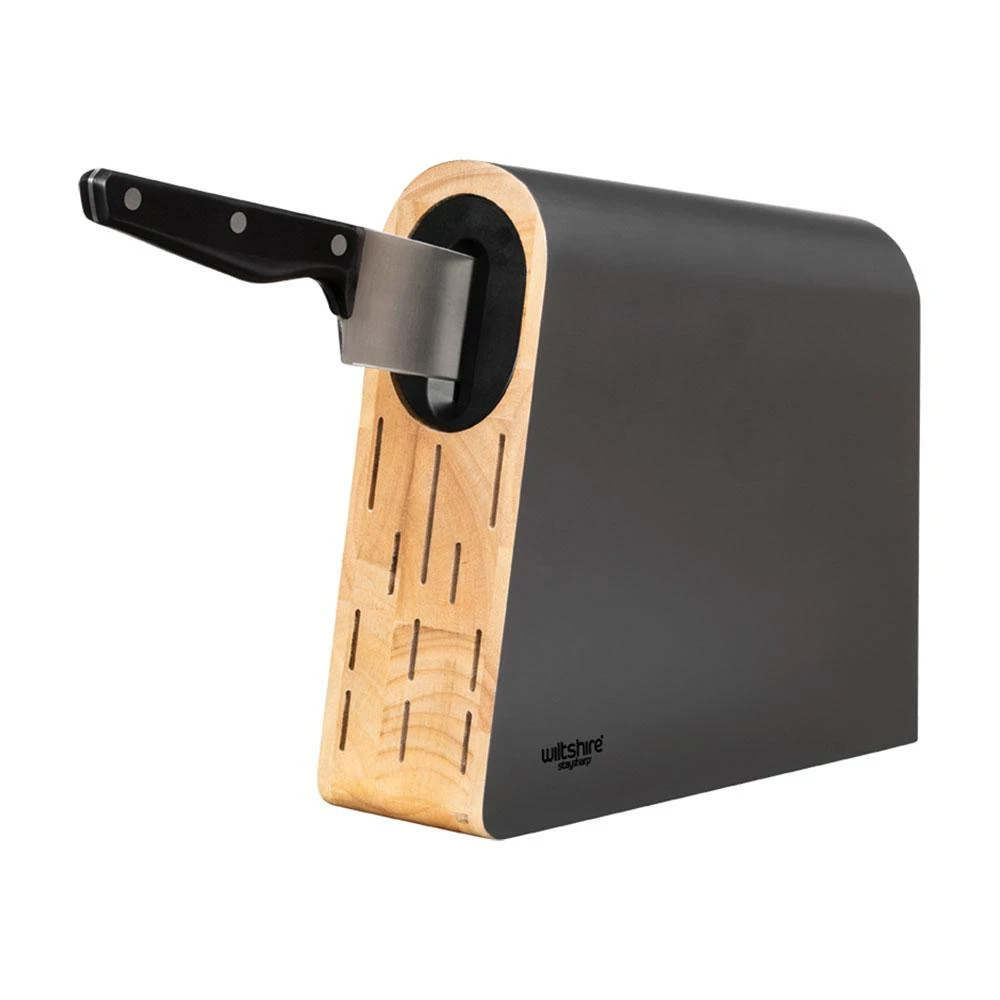 - Metallic grey wood storage block with built-in 2 stage sharpener.