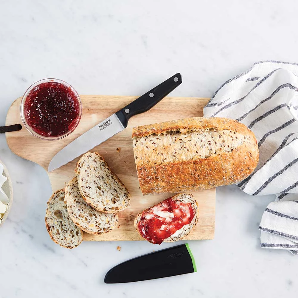 An everyday preparation knife for cutting crusty bread or tough skinned foods like tomatoes, this knife makes light work of food preparation with its Staysharp blade. Thanks to the patented self-sharpening system you can ensure no more blunt knives. Why you’ll love me… The Staysharp Multi-Purpose Utility Knife is a well-rounded knife that can slice through a hearty, layered deli sandwich, cleanly and effortlessly. It great for quartering club sandwiches, halving burgers, and slicing bagels. Then use the reverse edge of the blade to spread on the mustard or mayo with ease. Thanks to the clever self-sharpening system of Staysharp you can ensure no more blunt knives. Simply insert and withdraw the knife from the scabbard for a sharp knife every time. Like all Wiltshire knives, it made from superior quality stainless steel so it rust-resistant. So for all sandwiches great or small (and every spread in between), it the perfect accessory for lunch (and midnight snack) fans.