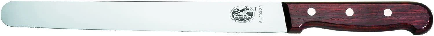 Victorinox Round Tip Plain Edge Slicing knife has a blade with a rosewood handle. These multifunctional knives are perfect for cutting meat and stripping pork or beef skins. The handle is made of wood material with superfine grip. The knives blade is made of high carbon stainless steel with a mirrored polish finish. The right blade hardness and the laser-tested cutting angle guarantee high edge retention.